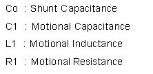 下圖就是將石英晶體共振子轉換成振蕩頻率附近的Butterworth-Van Dyke (BVD)等效電路. 在這個圖中, 有四個主要參數 : 靜態電容-Co, 動態電容-C1, 動態電感-L1及動態電阻-R1.