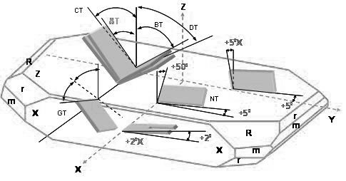 依據不同的應用領域及工作溫度需求, 因應了許多不同的石英切割角度種類. 例如AT-, BT-, CT-, DT-, NT, GT…..等不同的切割板片. 不同的切割方向的板片具有不同的彈性常數張量(elastic constant tensor), 不同的壓電常數張量(piezoelectric constant tensor)及不同的介電常數張量(dielectric constant tensor). 這些張量在石英組件的設計及應用上展現了不同的振蕩及溫度特性. (圖三)表現了在Z-plat石英結構上,幾種不同方向的石英板片切割方式.