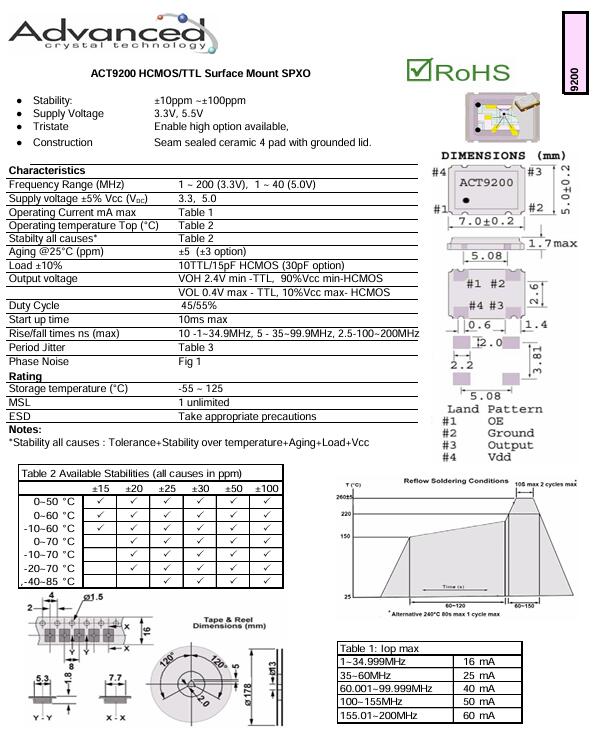 ACT9200 SPXO晶振,7050大尺寸晶振,電信設備石英晶體振蕩器