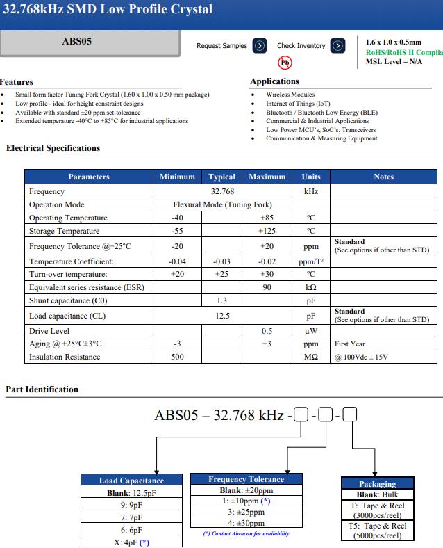 | ABS05-32.768KHZ-T | Abracon晶振 | ABS05 | kHz Crystal (Tuning Fork) | 32.768kHz | 2-SMD, No Lead |