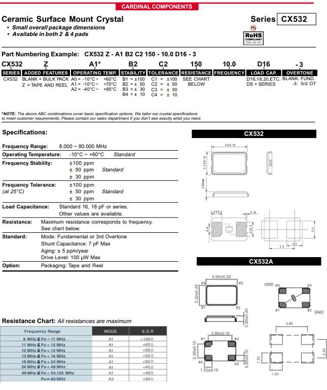 | CX532Z-A2B3C5-70-8.0D18 | Cardinal晶振 | CRYSTAL 8.0000MHZ 18PF SMD | CX532 | MHz Crystal | 8MHz | ±30ppm |