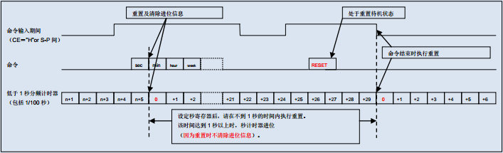 執(zhí)行重置時(shí)不清除進(jìn)位信息,為此請(qǐng)?jiān)谠O(shè)定秒寄存器后不到1秒的時(shí)間內(nèi)重置低于1秒的計(jì)時(shí)器;