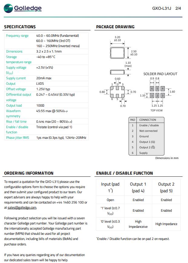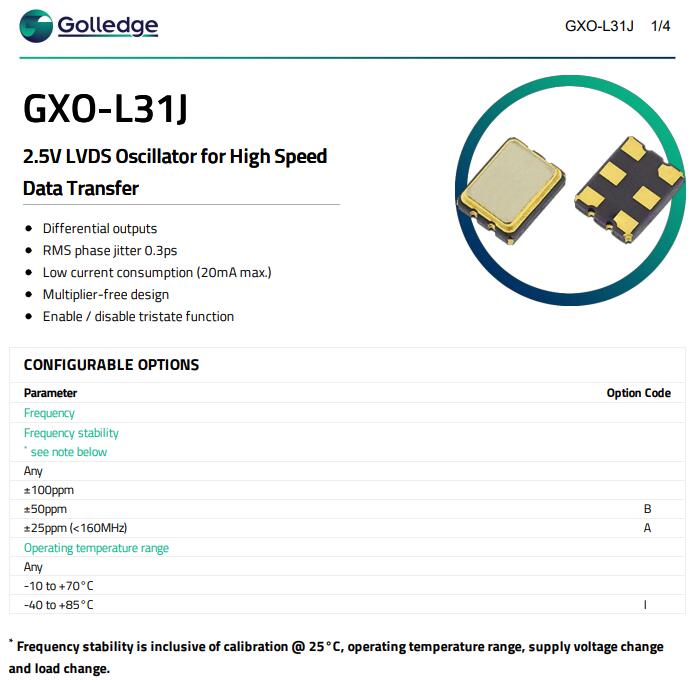 MP06754 GXO-L31 3225 125M差分LVDS Golledge英國高利奇晶振頻率容差和穩定性