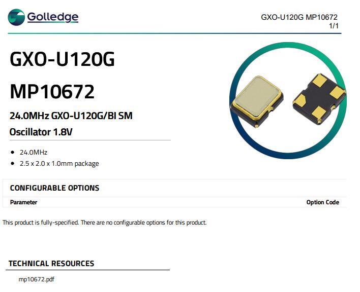 | MP10672 | Golledge | XTAL OSC 24.0000MHZ LVCMOS SMD | GXO-U120 | 1.8V | ±50ppm | -40°C ~ 85°C | 4 | 2520 |
