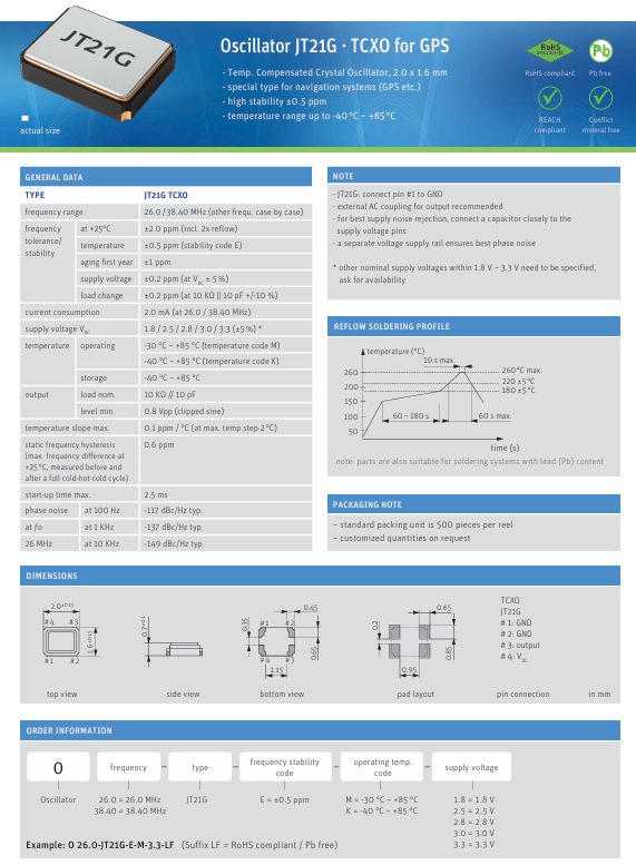 | O 26,0-JT21G-E-K-3,3-LF | Jauch Quartz | OSC TCXO 26MHZ 3.3V SNWV | TCXO | 削峰正弦波 | 3.3V | ±500ppb | -40°C ~ 85°C | 4 | 2016 |