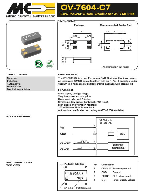隨之不久微晶公司發布了編碼OV-7604-C7-32.768kHz-20PPM-TB-QC,型號OV-7604-C7是一款低功耗時鐘石英晶體振蕩器32.768kHz,也是一款低頻SMT振蕩器,集成了CMOS電路和XTAL。它在真空下工作在一個密封的陶瓷包與陶瓷蓋。