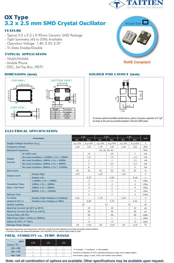 | OXETGLJANF-26.000000 | Taitien | OX | XO (Standard) | 26MHz | 3.3V |