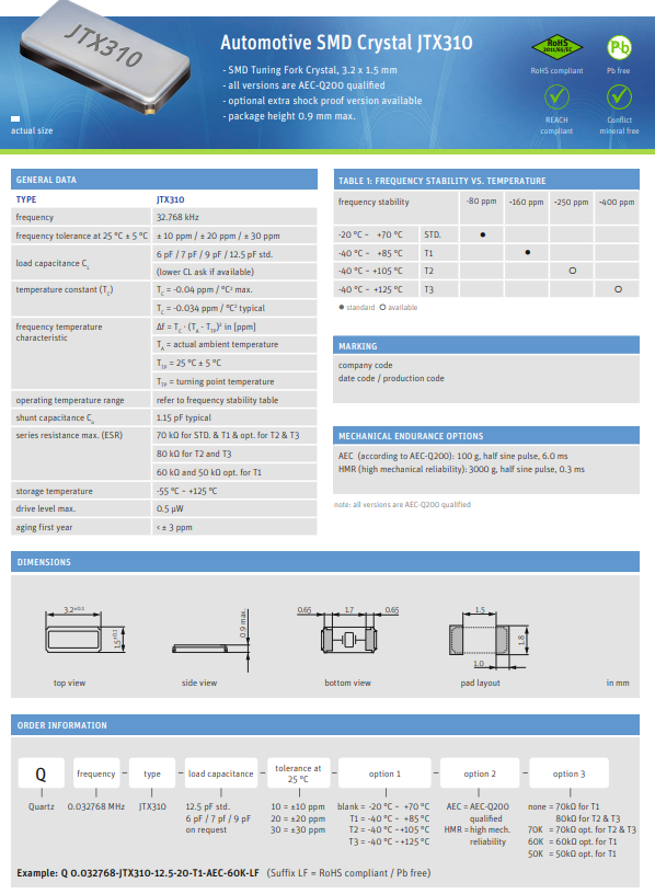 Q 0.032768-JTX310-7-20-T3-HMR-LF 3215 32.768K 7PF -40+125℃車規Jauch晶振