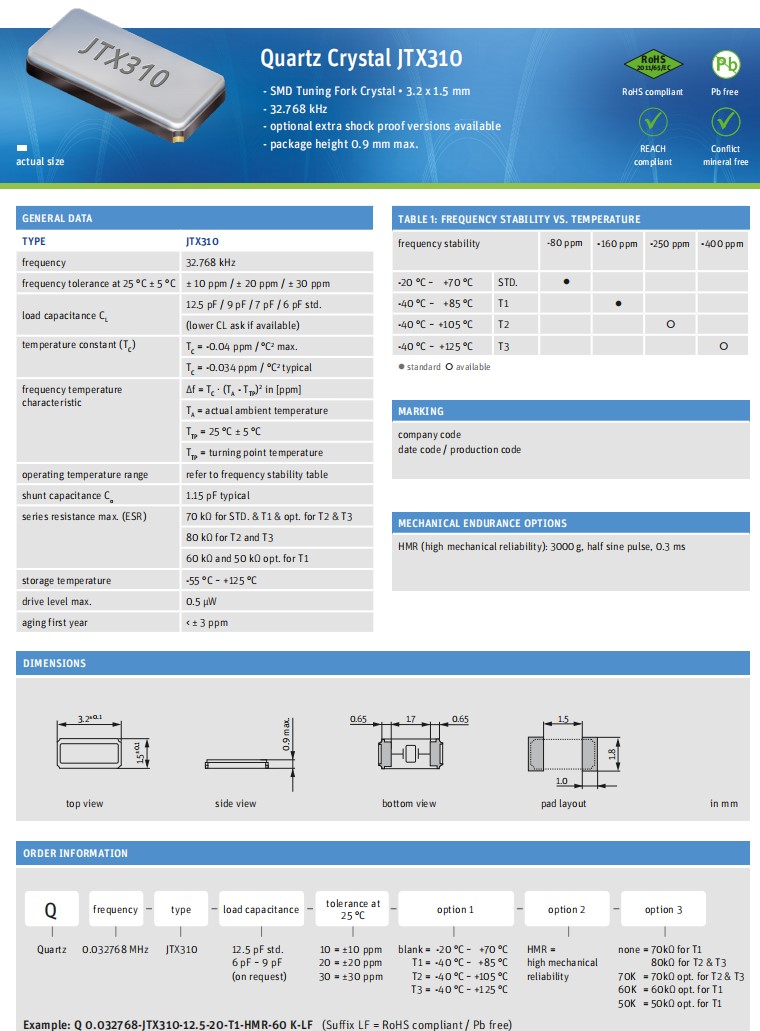 | Q 0.032768-JTX310-12.5-20-T1-HMR-50K-LF | Jauch Quartz | JTX310 | 32.768kHz | ±20ppm | 12.5pF | -40°C ~ 85°C | 2 | 3215 |