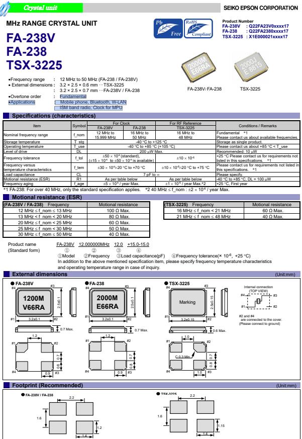 | Q22FA23V0053916 | 3.2 x 2.5 x 0.7mm | FA-238V | 12.800000 MHz | 12 pF | +/-50 ppm | +/-30 ppm | -20 to +70 °C |