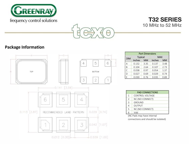 歐美Greenray晶振,聲表面諧振器3225有源晶振,六腳TCXO溫補晶振T32-T56-C-B-SD-26.0MHz-E