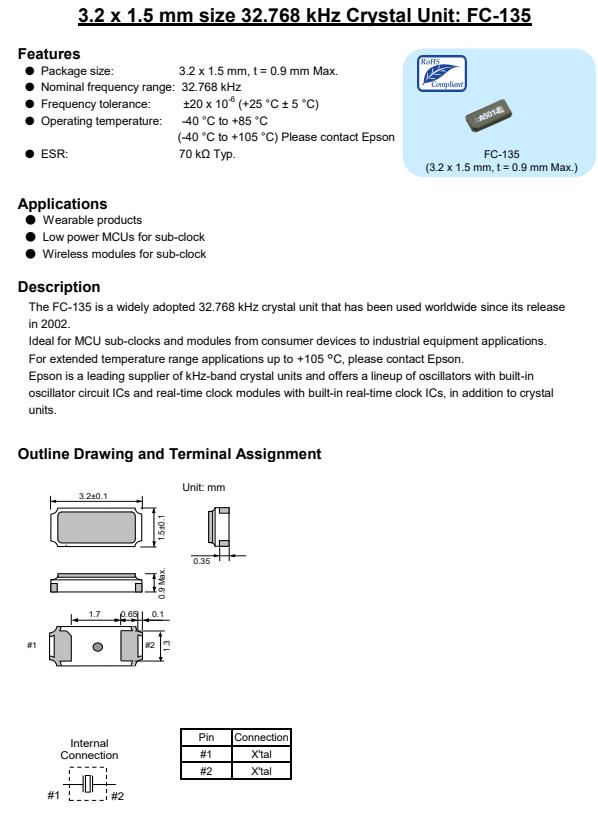 | X1A0001410001 | 3.2 x 1.5 x 0.9 mm | FC-135R | 32.768kHz | 7 pF | +/-20.0 ppm | -40 to +85 °C |