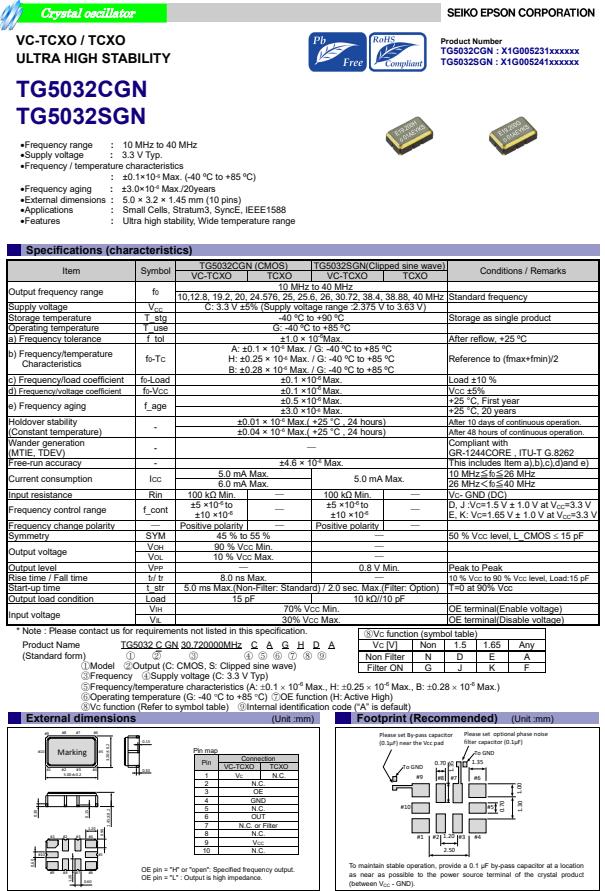 | X1G005241001400 | TG5032SGN | 10.000000 MHz | 5.00 x 3.20 x 1.45 mm | 3.135 to 3.465 V | +/-1.0 ppm | -40 to ++85 °C | +/-0.10 ppm |