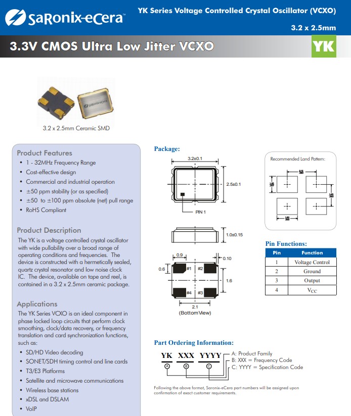 | YK 3.3V | None | CMOS | 1 至 66 | <2 ps RMS | 3.2 x 2.5 x 1.0 | 4 |