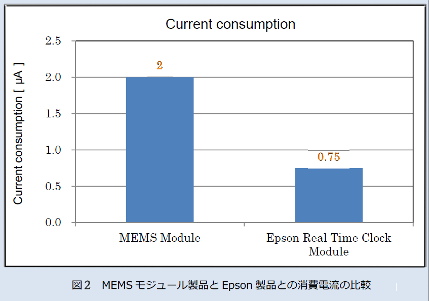 MEMS模塊產(chǎn)品,音叉石英晶體都是一樣的,難以實現(xiàn)低頻率,所以比較容易制造數(shù)百KHz成都的產(chǎn)品,用以時鐘的振蕩頻率和作為目的的頻率分周.圖二所示的是EPSON模塊產(chǎn)品和MEMS模塊的產(chǎn)品耗電說明.