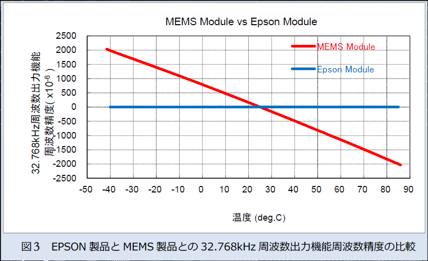 EPSON產(chǎn)品在-40~+85℃的溫度范圍能,高精度的頻率輸出的精度為±5×10-6(月差13秒),而MEMS產(chǎn)品頻率輸出的溫度校正,因為沒有相同的溫度范圍內(nèi)±0.2%(月差86分)和大功率精度的偏差.因此MEMS產(chǎn)品的頻率輸出不能使用.