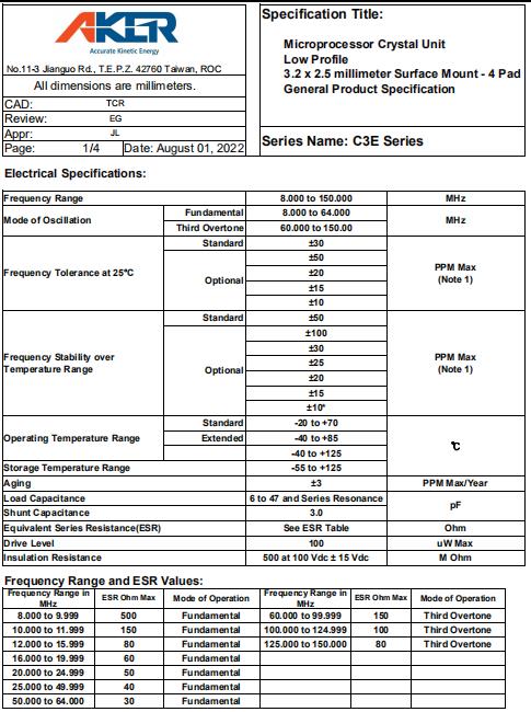 Aker Technology | 石英晶體 | Microprocessor Crystal Unit Low Profile 2.5 x 3.2 millimeter Surface Mount |