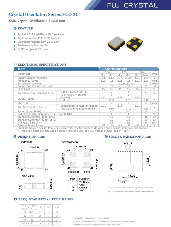 | FCO2C03333325CFY00 | Fuji 有源晶振 | XTAL OSC XO 33.3333MHZ CMOS SMD | FCO-2C | 2.5V | ±50ppm | -40°C ~ 85°C | 4腳 | 2520 |
